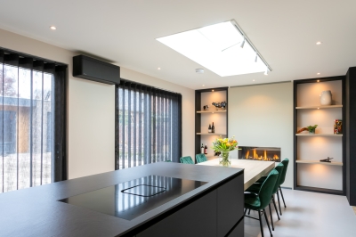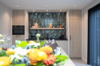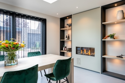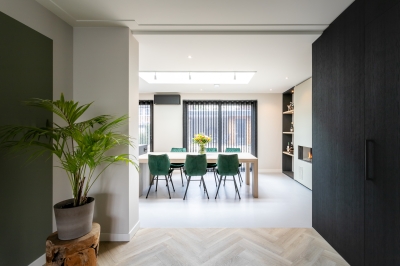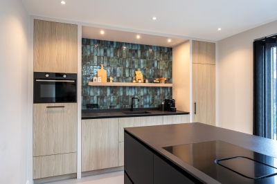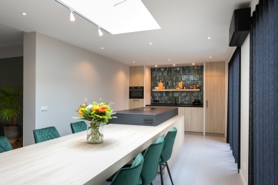 In deze opdracht is onze designer gestart met het maken van een uniek interieurontwerp. Niet alleen heeft zij gedacht over de look & feel van deze ruimte, maar ook over de functionaliteit en het design van de maatwerkelementen. Zo heeft deze maatwerkkeuken een eettafel welke overloopt in kookgedeelte. Daardoor lijkt het eiland zwevend in de ruimte te staan. De natuurlijke materialen en moderne kleuren zorgen voor een eigentijds sfeertje. Ook de diverse apparatuur sluit perfect aan in deze moderne keuken!