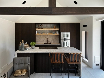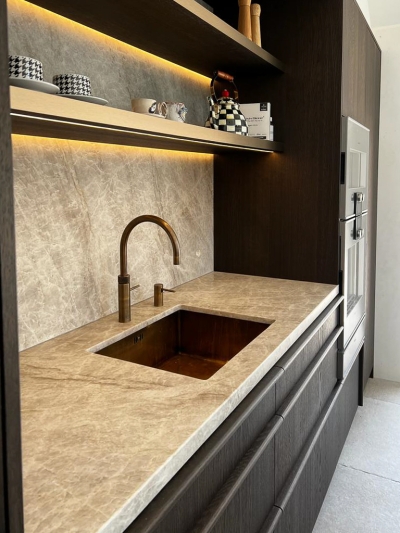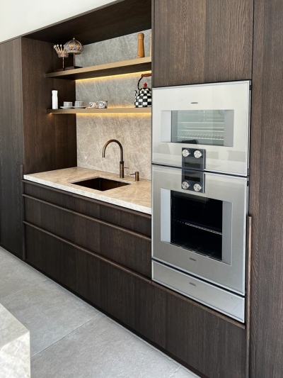 Wie liefde heeft voor koken voelt zich in deze maatwerk keuken helemaal thuis. Met de inductiekookplaat van Bora en de ovens van Gaggenau, kun je je lekker uitleven. Let ook op de details van het design van de keuken. Zie bijvoorbeeld de speciale grepen en de messing kleur spoelbak en Quooker. De bijzondere vorm en structuur van de voorkant van het keukeneiland maakt deze keuken extra uniek!
