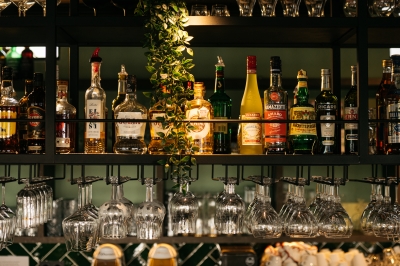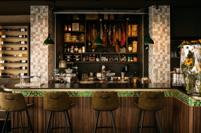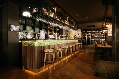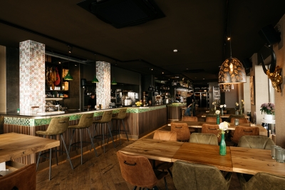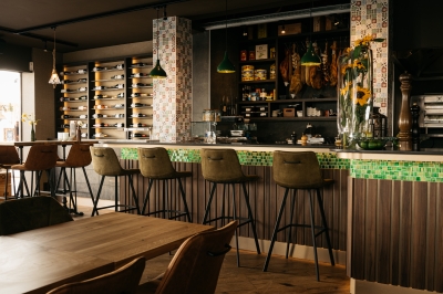 Voor de hoeveelheid wijnen hebben we 2 grote mooie maatwerkkasten mogen ontwerpen en maken. Deze kasten met wijnen zorgen voor een mooie presentatie van de wijnen welke meteen een gezellige sfeer geven. Zo ook de luifel welke boven de unieke maatwerk bar hangt. Deze sfeervolle barren vallen het meeste op door de groene mosaic rand. Het licht valt er direct op, waardoor het groen eruit knalt!