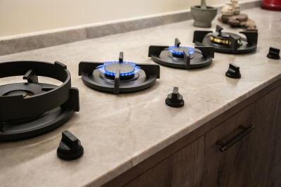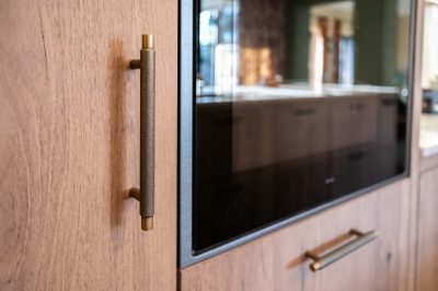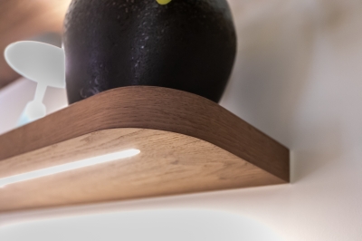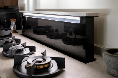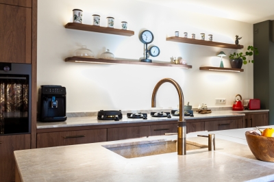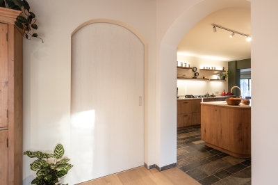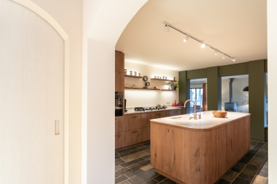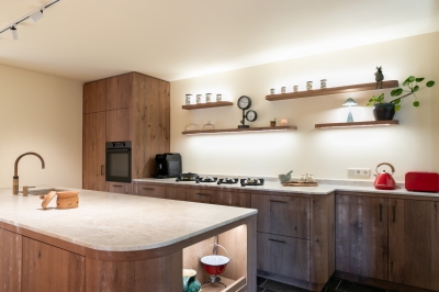 De rondingen van de bogen zie je terug in de afgeronde hoeken van het eiland en van de schappen. Nog een bijzonder detail is de PITT cooking op het aanrechtblad en de afzuiging welke pas omhoog komt wanneer hij van toepassing is.